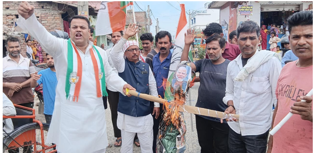 महंगाई कम करो, भाजपा-जदयू शर्म करो, मोदी-नीतीश मुर्दाबाद के नारों के बीच प्रखंड अध्यक्ष हैदर अंसारी के नेतृत्व में महंगाई की प्रतीक बन चुकी मोदी सरकार का पुतला दहन किया गया.