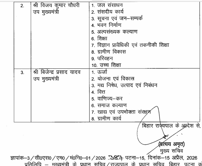 उपमुख्यमंत्री बिजेंद्र प्रसाद यादव को ऊर्जा,योजना एवं विकास,मद्य निषेध,उत्पाद एवं निबंधन समेत कुल 8 विभागों की जिम्मेदारी दी गई है.