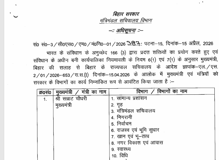 BIG BREAKING : बिहार में सम्राट कैबिनेट का बंटवारा, सीएम के पास 29 विभाग