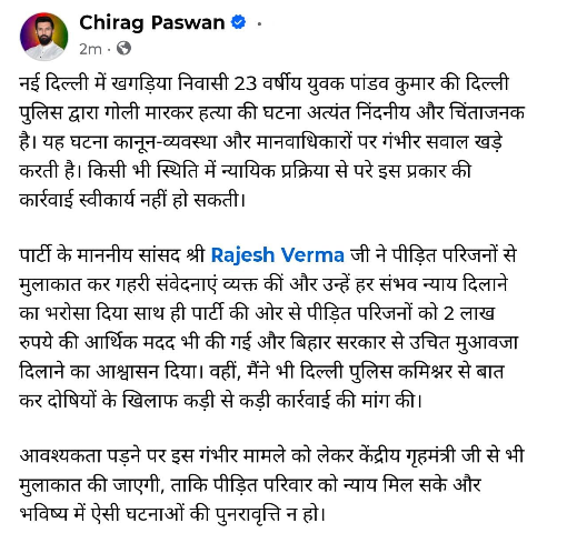 BIG NEWS : दिल्ली में बिहार के युवक की मौत पर केंद्रीय मंत्री चिराग पासवान ने जताई चिंता