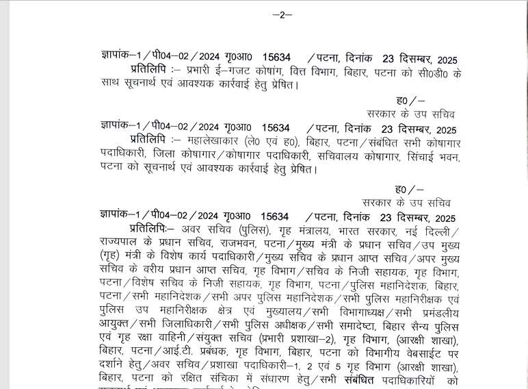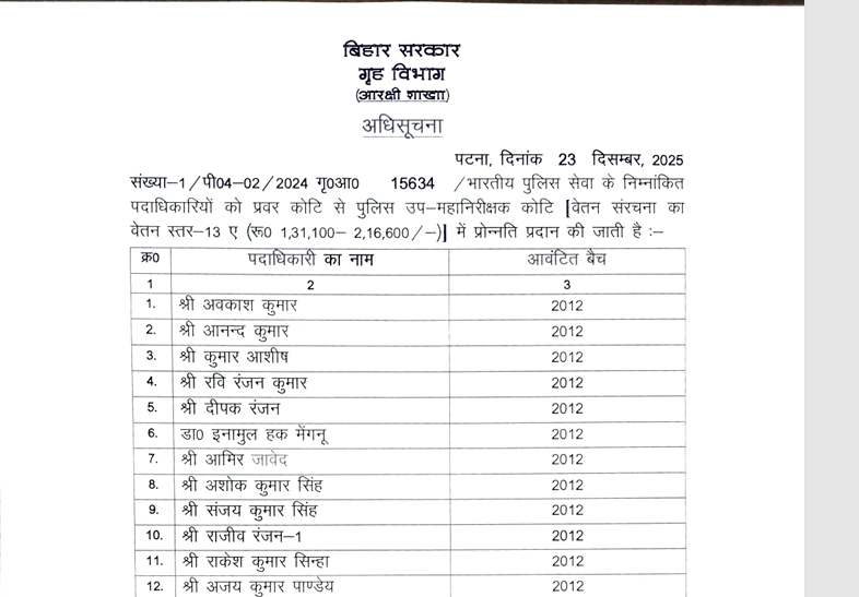 पटना: इस वक्त की बड़ी खबर बिहार की गृह विभागके गलियारे से आ रही है. बिहार सरकार के गृह विभाग (आरक्षी शाखा) ने भारतीय पुलिस सेवा (IPS)के2012बैच के22अधिकारियों को नववर्ष का तोहफा देते हुए प्रोन्नति प्रदान की है.