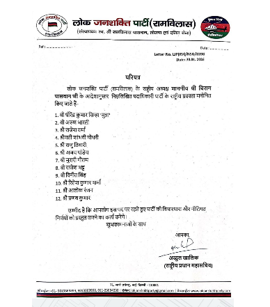 BIG NEWS : लोक जनशक्ति पार्टी (रामविलास) में बड़ा संगठनात्मक फैसला, 12 नेता राष्ट्रीय प्रवक्ता नियुक्त