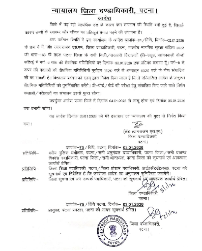 पटना : जिले में अत्यधिक ठंड और कम तापमान को देखते हुए जिला दंडाधिकारी ने बड़ा आदेश जारी किया है. आदेश के अनुसार प्री-स्कूल, आंगनबाड़ी सहित सभी सरकारी व निजी विद्यालयों में कक्षा 8 तक की शैक्षणिक गतिविधियां 8 जनवरी 2026 तक स्थगित रहेगी.