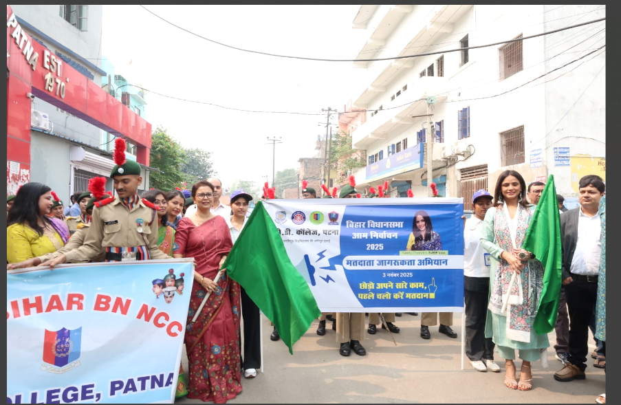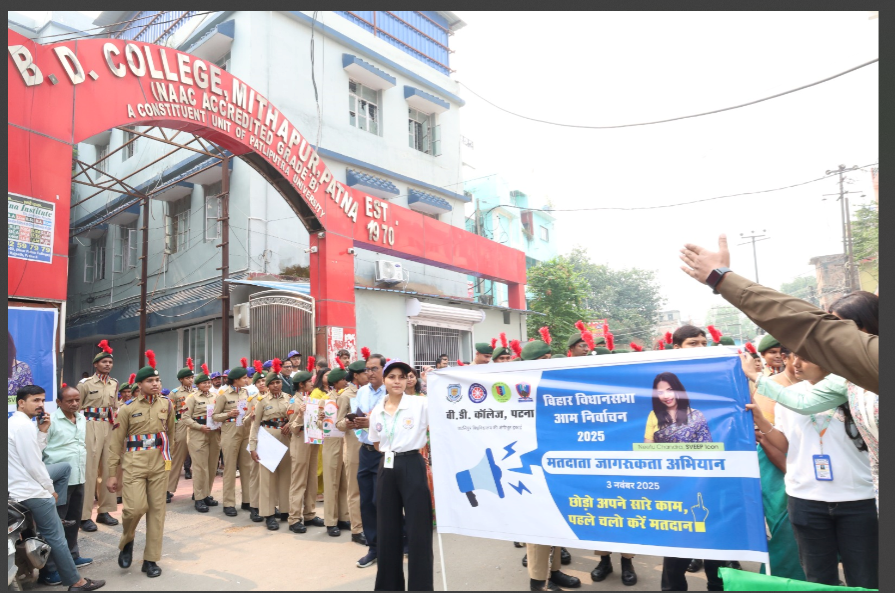 पटना : राजधानी पटना के बी. डी. कॉलेज परिसर में सोमवार को लोकतंत्र का एक जीवंत उत्सव देखने को मिला. राष्ट्रीय सेवा योजना (एनएसएस) और राष्ट्रीय कैडेट कोर (एनसीसी) की ओर से आयोजित एसवीईईपी (SVEEP) कार्यक्रम में युवाओं ने मतदाता जागरूकता का जोश और जिम्मेदारी दोनों का प्रदर्शन किया.