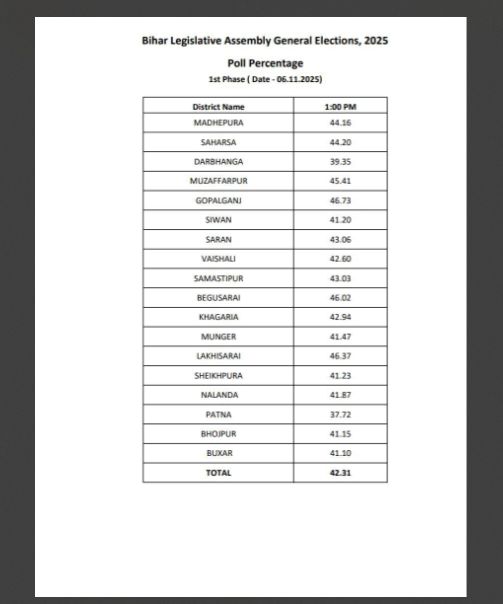 BIHAR ELECTION 2025 : पहले चरण में दोपहर 1 बजे तक 42.31 % मतदान