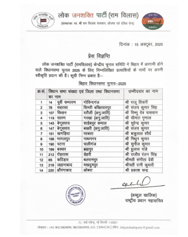 BIHAR ELECTION 2025 : लोक जनशक्ति पार्टी (रामविलास) ने विधानसभा चुनाव के लिए पहली सूची की जारी, 14 प्रत्याशियों के नामों का ऐलान