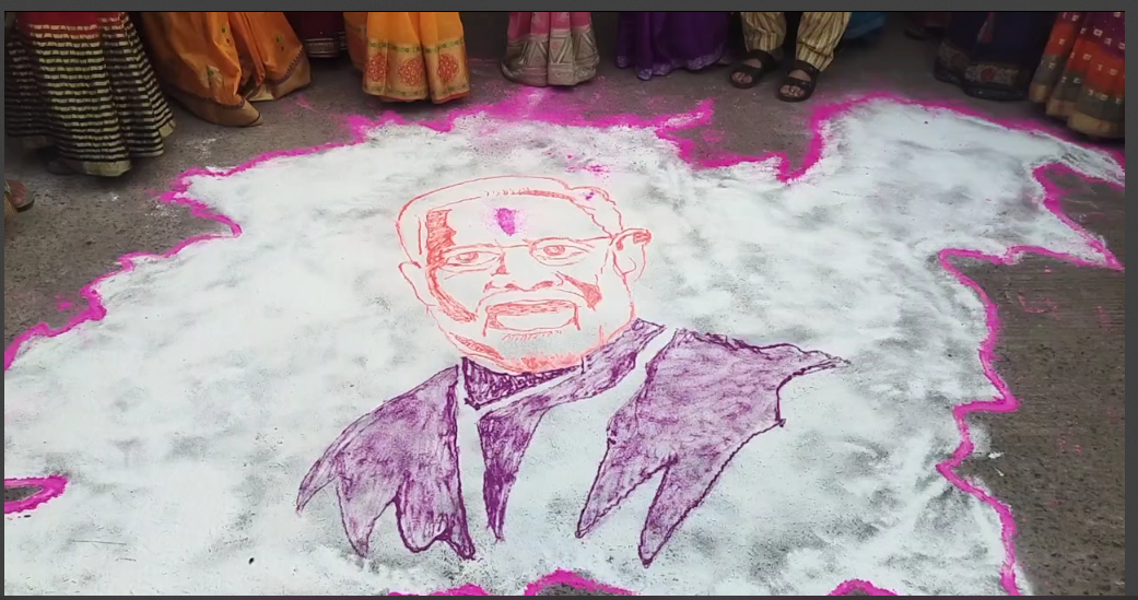 भागलपुर : प्रधानमंत्री नरेंद्र मोदी 6 नवंबर को भागलपुर में चुनावी जनसभा को संबोधित करेंगे. पीएम के आगमन को लेकर भागलपुर में एनडीए कार्यकर्ताओं और समर्थकों में खासा उत्साह देखा जा रहा है. इसी बीच भागलपुर के घंटाघर चौक पर महिला कार्यकर्ताओं ने प्रधानमंत्री मोदी के स्वागत में सुंदर रंगोली बनाकर अपनी खुशी जाहिर की है.