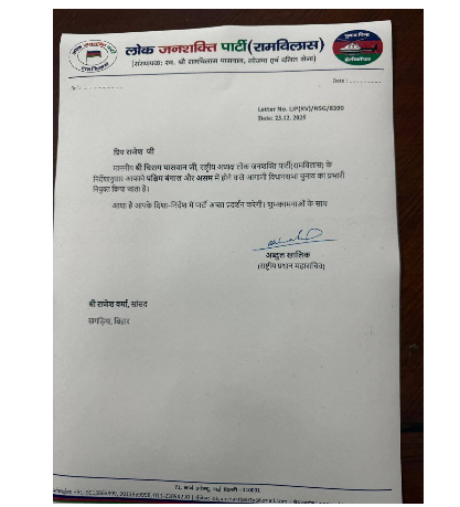 BIHAR NEWS : खगड़िया सांसद राजेश वर्मा को मिली बड़ी जिम्मेदारी, LJP (रामविलास) ने बनाया पश्चिम बंगाल व असम विधानसभा चुनाव का प्रभारी