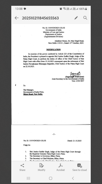 यह आदेश 21अकटूबर,2025 को जारी अधिसूचना के माध्यम से दिया गया. चीफ जस्टिस जस्टिस बजनथ्री 22अक्टूबर,2025 को सेवानिवृत हो रहे हैं. कानून और न्याय मंत्रालय की ओर से जारी सूचना में कहा गया है कि जस्टिस सुधीर सिंह 23 अक्टूबर,2025 से ये यह दायित्व निभाएंगे.