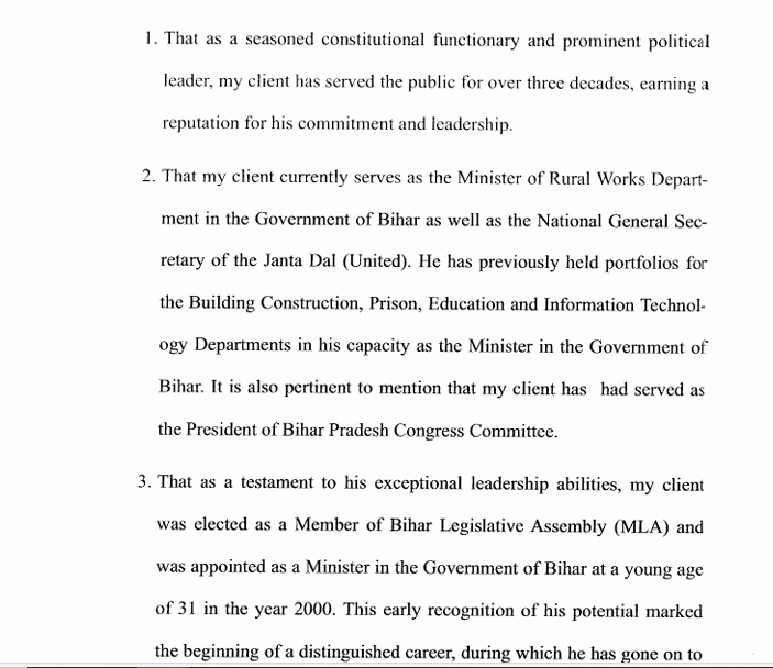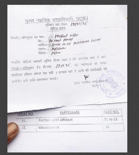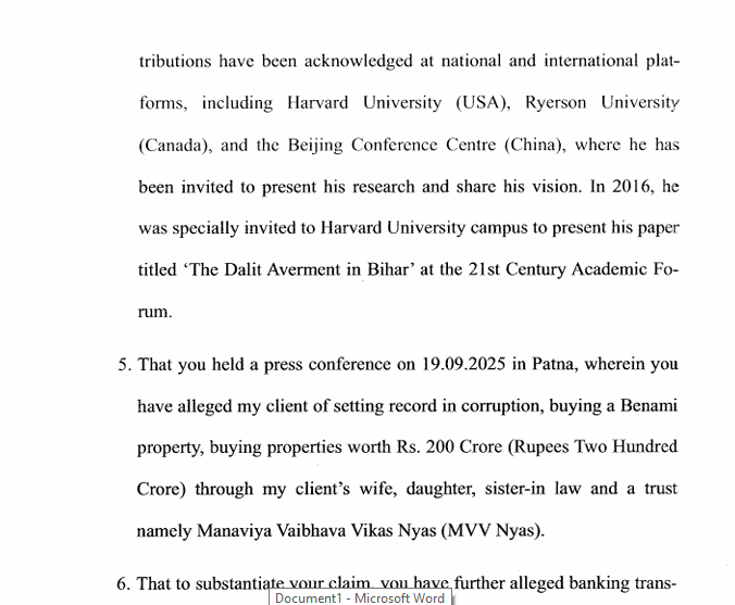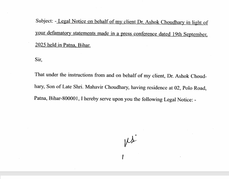 डॉ. चौधरी ने कहा कि प्रशांत किशोर द्वारा लगाए गए निराधार एवं भ्रामक आरोप उनकी घबराहट और बौखलाहट का परिणाम है. उन्होंने स्पष्ट किया कि इससे पहले भी उन्होंने प्रशांत किशोर पर मानहानि का मामला दायर किया था,जिसके अंतर्गत माननीय मुख्य न्यायिक दंडाधिकारी,पटना द्वारा परिवाद वाद संख्या 6989/2025 में प्रशांत किशोर को दिनांक 17.10.2025 को पेशी हेतु बुलाया गया है.