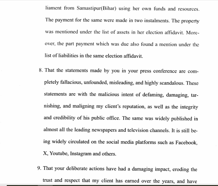 चौधरी ने बताया कि उनकी बेटी वर्तमान सांसद, समस्तीपुर की छवि भी धूमिल करने का प्रयास किया गया है. उनके बारे में बेनामी संपत्ति होने का झूठा आरोप प्रशांत किशोर द्वारा लगाया गया है. इस संबंध में यह स्पष्ट करना आवश्यक है कि जिस संपत्ति को लेकर बेनामी का आरोप लगाया जा रहा है, वह पूर्णतः निराधार है.