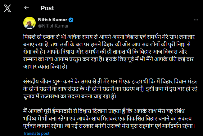 BIHAR POLITICS : नीतीश कुमार ने राज्यसभा में जाने का किया ऐलान, ट्वीट कर दी जानकारी