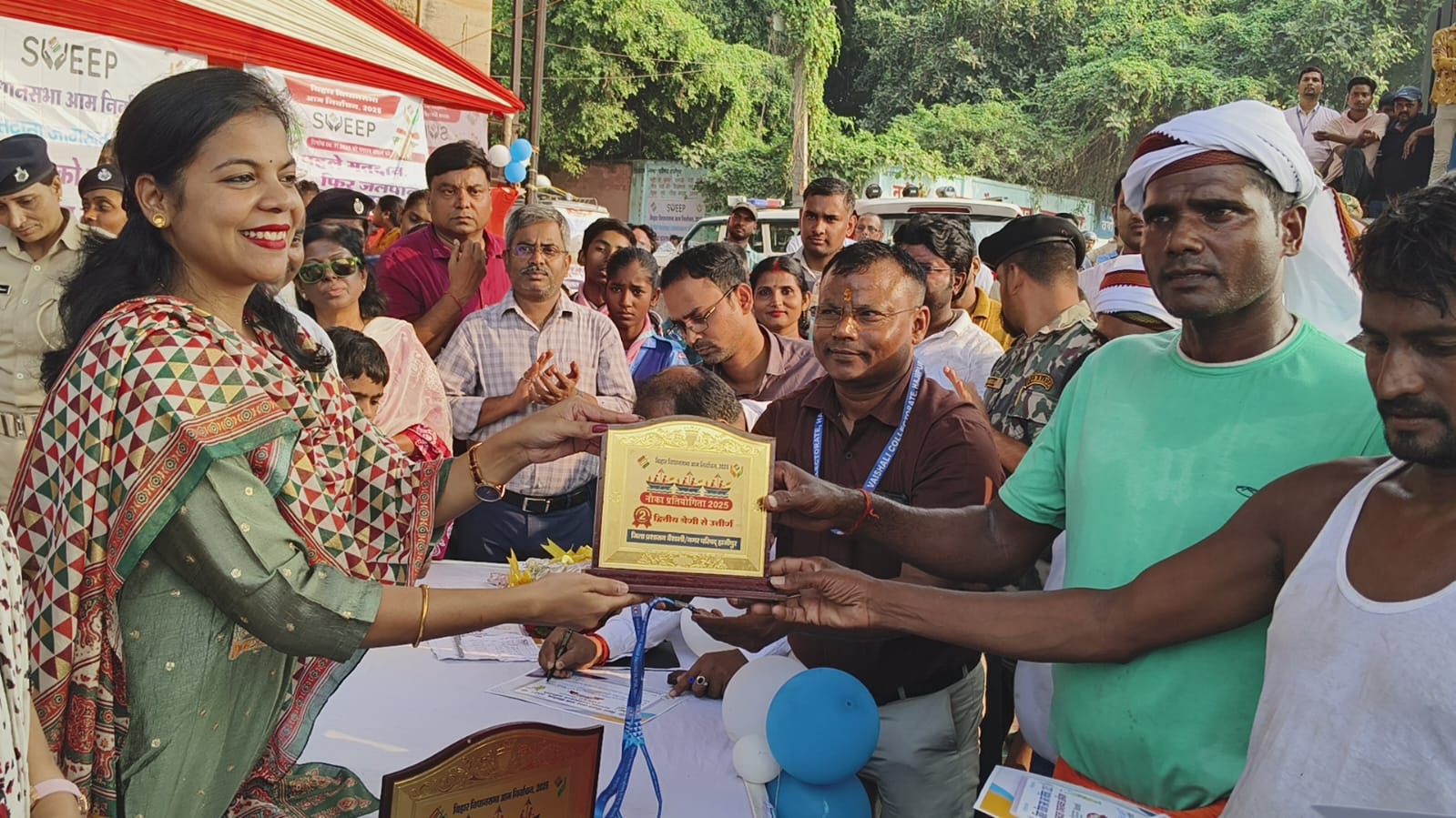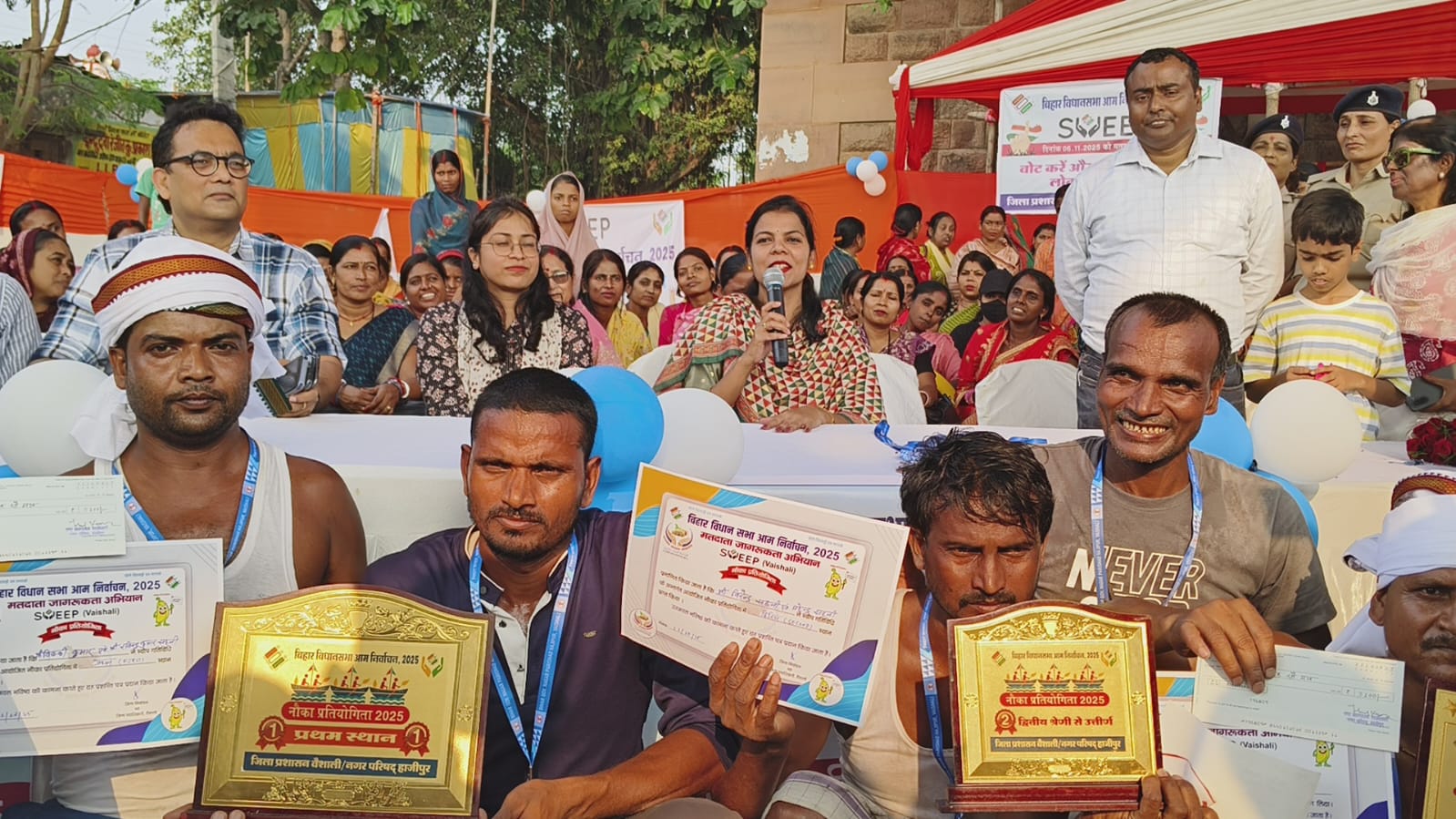 इस प्रतियोगिता में प्रथम द्वितीय एवं तृतीय स्थान प्राप्त करने वाले प्रतिभागियों को जिला पदाधिकारी ने पुरस्कृत भी किया गया। प्रतियोगिता में प्रथम स्थान प्राप्त करने वाले विक्की कुमार को5100रूपए और द्वितीय स्थान पाने वाले वीरेन्द्र सहनी को4100रूपए तथा तृतीय स्थान प्राप्त करने वाले सत्येन्द्र सहनी3100को पुरस्कृत किया गया। वहीं पुरस्कृत पाने के बाद नाविकों में काफी खुशी देखी गई। जिलाधिकारी ने उपस्थित सभी लोगों से दिनांक6.11.2025को अधिक से अधिक संख्या में अपने-अपने बूथ पर जाकर मताधिकार का प्रयोग करने, अपने परिवार एवं आसपास के लोगों को मतदान करने हेतु प्रेरित करने का संदेश दिया।