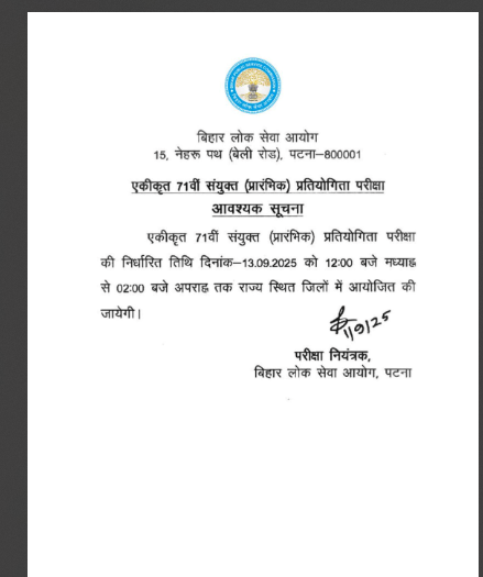 BPSC 71st Exam Date 2025 : बिहार लोक सेवा आयोग की 71वीं संयुक्त( प्रारंभिक) परीक्षा होगी 13 सितंबर को