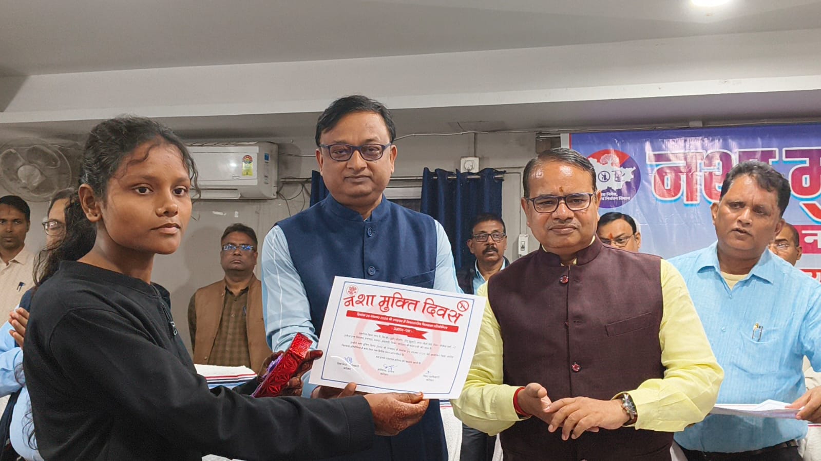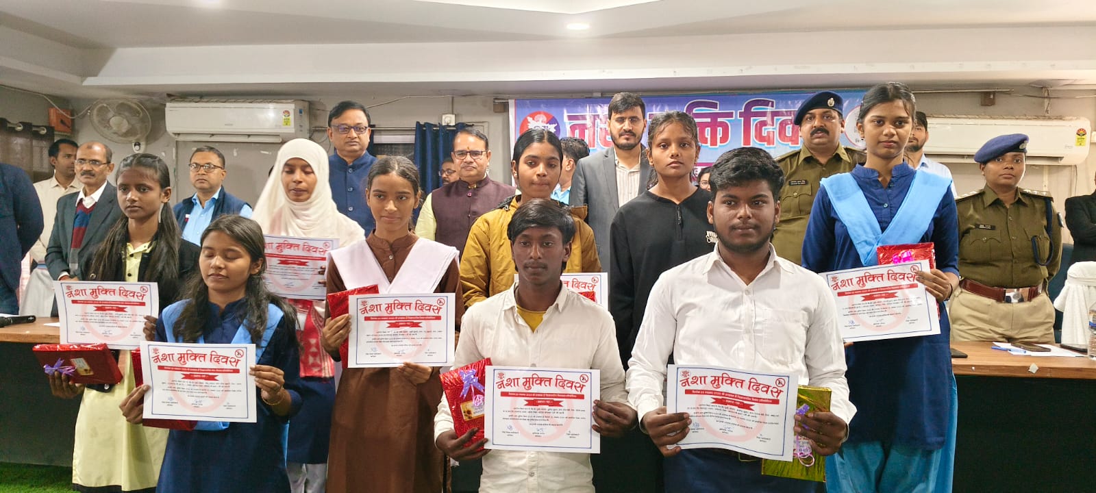 नशा मुक्ति दिवस के मौके पर आयोजित प्रतियोगिता में छात्र छात्राओं को प्रमाणपत्र दिया गया साथ हीं उत्पाद विभाग को भी सम्मानित किया गया।