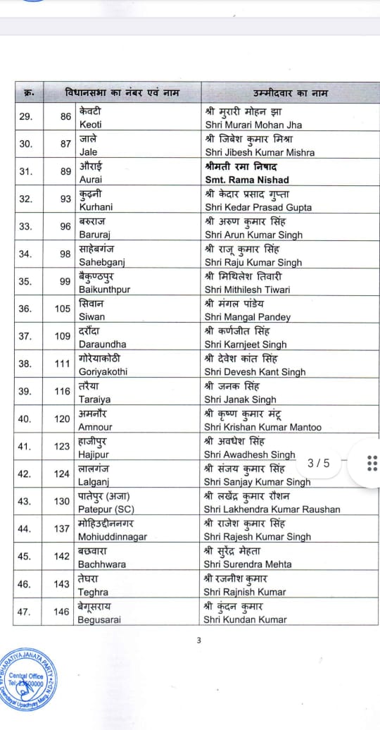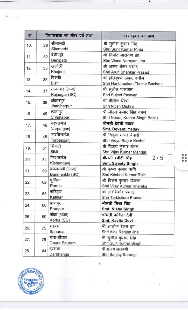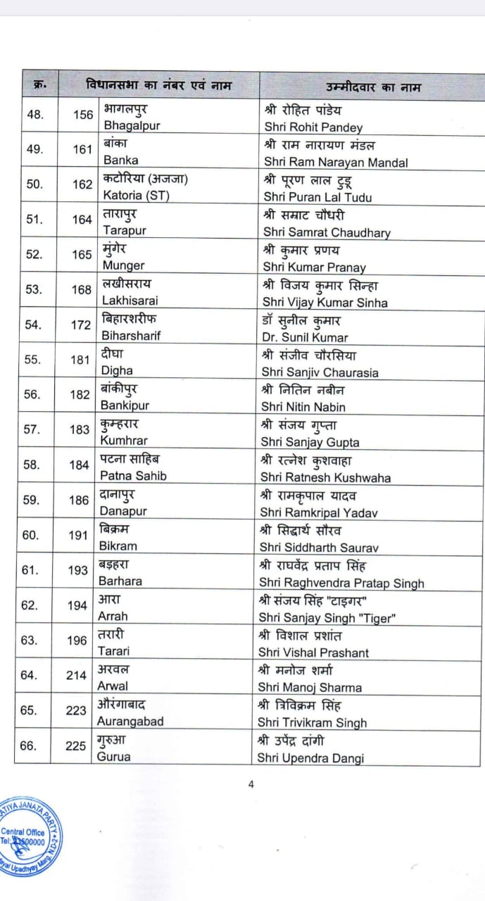 बिहार:- भारतीय जनता पार्टी केन्द्रीय चुनाव समिति की बैठक जगत प्रकाश नड्डा की अध्यक्षता में दिनांक 12.10.2025 को सम्पन्न हुई।बैठक में प्रधानमंत्री नरेन्द्र मोदी,रक्षा मंत्री राजनाथ सिंह, गृह मंत्री अमित शाह एवं केन्द्रीय चुनाव समिति के अन्य सदस्य उपस्थित रहें।केन्द्रीय चुनाव समिति ने बिहार में होने वाले विधानसभा चुनाव 2025 के लिए निम्नलिखित नामों पर अपनी स्वीकृति प्रदान की है।