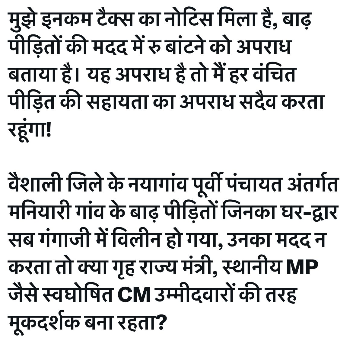 ऐसे समय में सांसद पप्पू यादव जी वहाँ पहुँचे,राहत सामग्री और आर्थिक सहयोग प्रदान किया जबकि यह क्षेत्र उनके संसदीय क्षेत्र से बाहर है और वहाँ के चुनावों में उनकी कोई प्रत्यक्ष राजनीतिक भागीदारी भी नहीं रही है। उनका यह कदम न राजनीति से प्रेरित था,न किसी प्रचार का हिस्सा,बल्कि पूरी तरह मानवता और संवेदना से प्रेरित सेवा-भाव था। अगर बाढ़ पीड़ितों की मदद करना अपराध है, तो वह यह अपराध हमेशा करते रहेंगे.