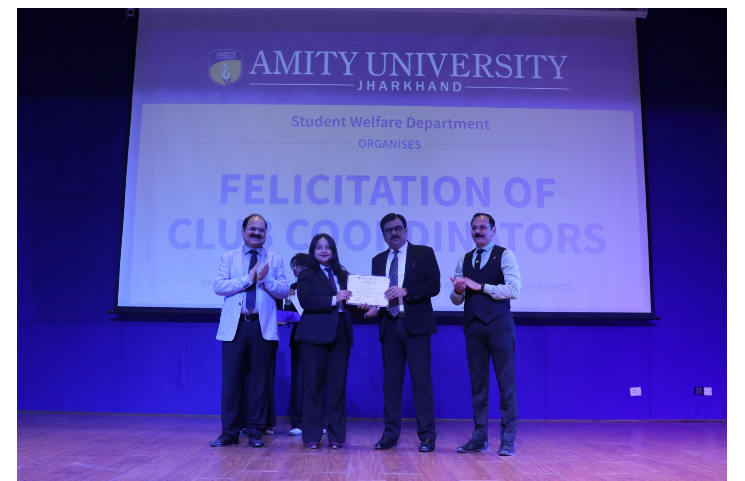 रांची : एमिटी यूनिवर्सिटी झारखंड के विज़न एवं मिशन के अनुरूप तथा इसके संस्थापक अध्यक्ष एवं कुलाधिपति के आशीर्वाद से,स्टूडेंट वेलफेयर डिपार्टमेंट (SWD)द्वारा23अप्रैल2026को यूनिवर्सिटी क्लब कोऑर्डिनेटर्स2025-26,नेशनल एजुकेशन पॉलिसी (NEP)सारथी2025-26का सम्मान समारोह आयोजित किया गया.इसके साथ ही संगठन2025के विजेताओं को भी सम्मानित किया गया.