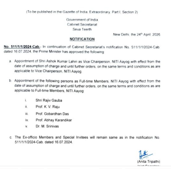 केंद्र सरकार ने नीति आयोग में किया बड़ा फेरबदल : अशोक कुमार लाहिड़ी नीति आयोग के बने उपाध्यक्ष , नए फुल-टाइम सदस्यों की भी हुई एंट्री