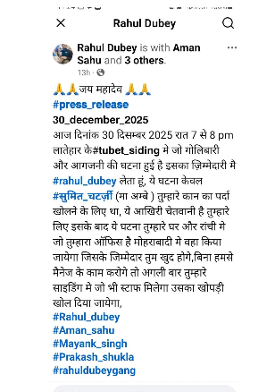 राहुल दुबे गैंग ने सोशल मीडिया पर प्रेस विज्ञप्ति पोस्ट करते हुए लिखा कि बीती रात को तुबेद कोल साइडिंग में गोलीबारी और आगजनी की जिम्मेदारी लेता हूं. उन्होंने लिखा कि घटना केवल सुमित चटर्जी मां अंबे का कान का पर्दा खोलने के लिए किया गया है और यह आखिरी चेतावनी है. यदि मैनेज बगैर ट्रान्सपोर्ट कार्य किया गया तो अगला हमला घर के साथ रांची ऑफिस में किया जाएगा. इधर घटना की सूचना के साथ स्थानीय पुलिस गहन तफ्तीश शुरु कर दी है.