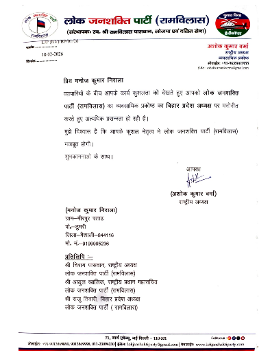 लोजपा (रामविलास) का बड़ा संगठनात्मक फैसला : बिहार में व्यवसायिक प्रकोष्ठ को मिला नया नेतृत्व, मनोज कुमार निराला बने प्रदेश अध्यक्ष