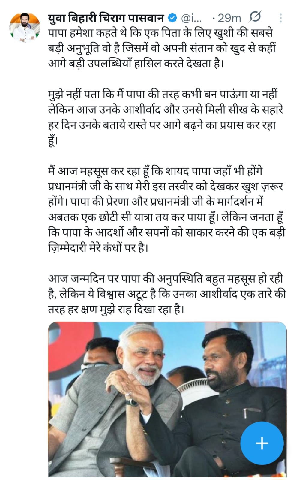 चिराग ने कहा कि उन्हें नहीं पता कि वे अपने पापा की तरह बन पाएंगे या नहीं, लेकिन उनके आशीर्वाद और सीख के सहारे वे हर दिन उनके बताए रास्ते पर आगे बढ़ने का प्रयास कर रहे हैं।प्रधानमंत्री नरेंद्र मोदी के साथ अपनी एक तस्वीर साझा करते हुए चिराग ने लिखा आज महसूस कर रहा हूँ कि शायद पापा जहाँ भी होंगे, प्रधानमंत्री जी के साथ मेरी इस तस्वीर को देखकर खुश ज़रूर होंगे। पापा की प्रेरणा और प्रधानमंत्री जी के मार्गदर्शन में अबतक एक छोटी-सी यात्रा तय कर पाया हूँ।