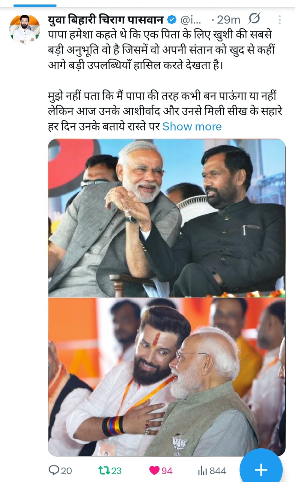 इस पोस्ट के साथ चिराग ने अपने पिता रामविलास पासवान और प्रधानमंत्री नरेंद्र मोदी की एक पुरानी तस्वीर भी साझा की,जिसमें दोनों मुस्कुराते हुए नजर आ रहे हैं।