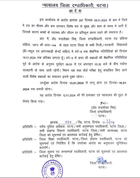 वहीं पटना DM डॉ. चंद्रशेखर सिंह की ओर से जारी आदेश में कहा गया है कि जिले में ठंड का मौसम और कम तापमान विशेष रूप से सुबह और शाम के समय में जारी है। जिसके कारण बच्चों के स्वास्थ्य और जीवन पर प्रतिकूल प्रभाव पड़ने की संभावना है। ऐसे में दंड प्रक्रिया संहिता, 1973 की धारा-144 के तहत पटना जिला के सभी निजी और सरकारी स्कूलों (प्री-स्कूल एवं आंगनबाड़ी केन्द्रों सहित) में वर्ग-8 तक शैक्षणिक गतिविधियों को दिनांक 16.01.2024 तक प्रतिबंध लगाया जाता है।