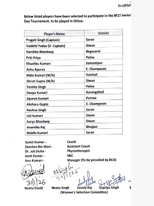 BIHAR NEWS : BCA ने ओडिशा में सीनियर महिला वनडे टूर्नामेंट के लिए बिहार महिला सीनियर टीम की घोषणा की
